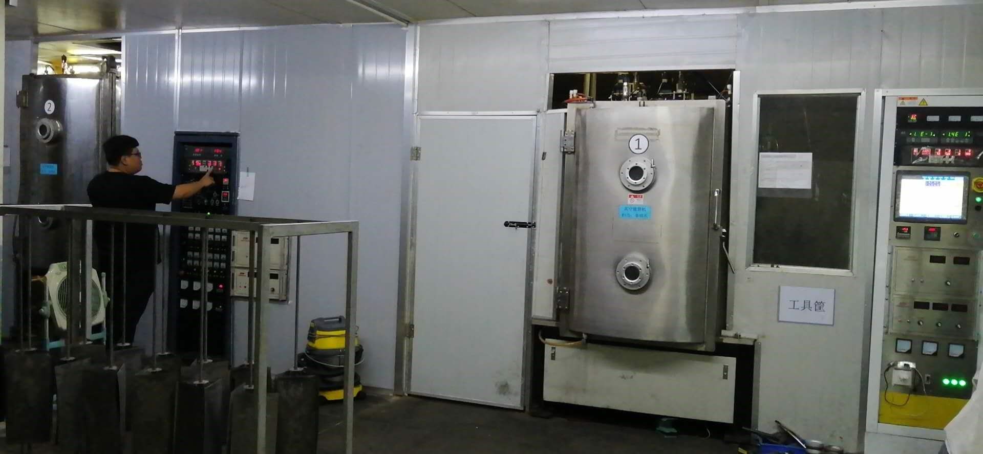 我們又去參觀了真空鍍車間,原來真空鍍一般跟蝕刻是相連的,也就是說很多不銹鋼產(chǎn)品要先蝕刻出形狀來,再根據(jù)客戶的要求鍍上顏色,顏色一般分金色,玫瑰金,槍聲,黑色,灰色等等。青島大東電子有兩臺(tái)真空鍍設(shè)備,老板說是從韓國買的,特別貴,我很是羨慕。